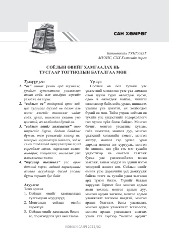 %u041d%u041e%u041c%u042b%u041d %u0421%u0410%u041d%u0427 2022/0247%u0422%u04af%u043b%u0445%u04af%u04af%u0440 %u04af%u0433%u0441:1. %u201c%u04e9%u0432%u201d %u04e9%u043c%u043d%u04e9%u0445 %u04af%u0435%u0438%u0439%u043d %u0430%u0440%u0434 %u0442%u04af%u043c%u043d%u044d%u044d%u0441, %u0443%u0440%u044c%u0434%u044b%u043d %u0437%u04af%u0442%u0433%u044d%u043b%u0442%u043d%u044d%u044d%u0441 %u0443%u043b%u0430%u043c%u0436%u043b%u0430%u043d %u0430%u0432%u0441%u0430%u043d %u0441%u043e%u0451%u043b, %u0430%u0436 %u0430%u043c%u044c%u0434%u0440%u0430%u043b %u0437%u044d%u0440%u0433%u0438%u0439%u043d %u04af%u0437%u044d%u0433%u0434%u044d%u043b, %u04e9%u0432 %u0445%u043e%u0440%u0448.2. %u201c%u0441%u043e%u0451%u043b%u044b%u043d %u04e9%u0432%u201d %u0442%u043e%u0434%u043e%u0440%u0445%u043e%u0439 %u043e%u0440%u043e%u043d %u0437%u0430%u0439, %u0446%u0430%u0433 %u0445%u0443%u0433%u0430%u0446%u0430%u0430%u0433 %u0431%u04af%u0445%u044d%u043b%u0434 %u043d%u044c %u0431%u043e%u043b%u043e%u043d %u0430%u043b%u044c %u043d%u044d%u0433%u044d%u043d %u0445%u044d%u0441%u0433%u0438%u0439%u0433 %u0442%u04e9%u043b%u04e9%u04e9%u043b%u0436 %u0447%u0430%u0434%u0430%u0445 %u0441%u043e%u0451%u043b, %u0443%u0440%u043b%u0430%u0433, %u0448%u0438%u043d%u0436%u043b%u044d%u0445 %u0443%u0445%u0430%u0430%u043d%u044b %u04af%u043d%u044d %u0446%u044d%u043d%u044d%u0442%u044d%u0439, %u0430%u0447 %u0445%u043e%u043b%u0431%u043e%u0433%u0434%u043e%u043b %u0431%u04af%u0445%u0438%u0439 %u04e9%u0432.3. %u201c%u0441%u043e%u0451%u043b%u044b%u043d %u04e9%u0432%u0438%u0439%u0433 %u0445%u0430%u043c%u0433%u0430%u0430%u043b%u0430%u0445%u201d %u0442%u043e%u043e %u0448%u0438%u0440%u0445%u0433%u0438%u0439%u0433 %u0431%u04af%u0440%u044d%u043d, %u0431%u043e%u0434%u0438%u0442 %u0431%u0430%u0439%u0434%u043b%u044b%u0433 %u0431%u04af%u0442%u044d%u043d, %u04e9%u043d%u0433%u04e9 %u04af%u0437%u044d%u043c%u0436%u0438%u0439%u0433 %u0445%u044d%u0432%u044d%u044d%u0440 %u043d%u044c, %u0447%u0430%u043d%u0430%u0440%u044b%u0433 %u043c%u0443%u0443%u0442%u0433%u0430%u0445%u0433%u04af%u0439 %u0431%u0430%u0439%u043b%u0433%u0430%u0445, %u044d%u043b%u0434%u044d%u0432 %u0433%u044d%u043c%u0442 %u0445%u0430%u043b%u0434%u043b%u0430%u0433%u0430%u0434 %u0430%u0432%u0442%u0443%u0443%u043b%u0430%u0445%u0433%u04af%u0439%u043d %u0442%u0443%u043b%u0434 %u0441%u044d%u0440%u0433%u0438%u0439%u043b%u0436 %u0441%u0430%u0445%u0438%u0445, %u0445%u0430%u0440%u0433%u0430%u043b%u0437%u0430%u043d %u0441%u0430%u0445%u0438%u0445, %u04e9%u043c%u04e9%u04e9%u0440%u04e9%u0445, %u0445%u0430%u0430%u0446%u0430%u0439%u043b%u0430%u0445, %u04e9%u043c%u0433%u04e9%u04e9%u043b%u04e9%u0445 %u04af%u0439%u043b %u0430%u0436%u0438%u043b%u043b%u0430%u0433%u0430%u0430%u0433 %u0445%u044d%u043b%u043d%u044d.4. %u201c%u0442%u0443%u0441%u0433%u0430%u0430%u0440 %u0442%u043e%u0433%u0442%u043d%u043e%u043b%u201d %u0443%u043b%u0441 %u043e%u0440%u043e%u043d %u0434%u043e%u0442%u043e%u043e%u0434 %u0445%u044d%u0440%u044d%u0433, %u0433%u0430%u0434%u0430%u0430%u0434 %u0445%u0430%u0440%u0438%u043b%u0446%u0430%u0430%u043d%u044b %u0430%u043b%u0438%u0432%u0430%u0430 %u0430%u0441%u0443%u0443%u0434%u043b%u0430%u0430%u0440 %u0431%u0443%u0441%u0430%u0434 %u0443%u043b%u0441%u0430%u0430%u0441 %u0431%u04af%u0440%u044d%u043d %u0445%u0430%u0440%u0430%u0430%u0442 %u0431%u0443%u0441 %u0431%u0430%u0439%u0445%u0410%u0433%u0443%u0443%u043b%u0433%u0430:%u0422%u043e%u0432%u0447 %u043e%u0440%u0448%u0438%u043b1. %u0421%u043e%u0451%u043b%u044b%u043d %u04e9%u0432%u0438%u0439%u0433 %u0445%u0430%u043c%u0433%u0430%u0430%u043b%u0430%u0445%u0430%u0434 %u0442%u0443%u043b%u0433%u0430%u043c%u0434%u0441%u0430%u043d %u0430%u0441%u0443%u0443%u0434%u043b%u0443%u0443%u04342. %u041c%u043e%u043d%u0433%u043e%u043b%u044b%u043d %u0441%u043e%u0451%u043b%u044b%u043d %u04e9%u0432%u0438%u0439%u043d %u0442%u04e9%u0440%u04e9%u043b%u0437%u04af%u04393. %u0421%u043e%u0451%u043b%u044b%u043d %u04e9%u0432%u0438%u0439%u0433 %u0445%u0430%u043c%u0433%u0430%u0430%u043b%u0430%u0445 %u0431%u043e%u0434%u043b%u043e%u0433%u043e, %u0445%u044d%u0440%u044d%u0433%u0436%u04af%u04af%u043b%u044d%u0445 %u04af%u0439%u043b %u0430%u0436%u0438%u043b%u043b%u0430%u0433%u0430%u0430%u04ae%u0440 %u0434%u04af%u043d%u0421%u043e%u0451%u043b%u044b%u043d %u04e9%u0432 %u0431%u043e%u043b %u0442%u0443%u0445%u0430%u0439%u043d %u0443%u043b%u0441 %u04af%u043d%u0434%u044d%u0441%u0442%u043d%u0438%u0439 %u0445%u044d%u043c%u0436%u044d%u044d%u043d%u0434 %u04af%u0435%u044d%u0441 %u04af%u0435%u0434 %u0434%u0430%u043c%u0436%u0438%u043d %u043e%u043b%u043e%u043d %u0437%u0443%u0443%u043d%u044b %u0442%u0443%u0440%u0448 %u04e9%u0432%u043b%u04e9%u0433%u0434%u04e9%u0436 %u0438%u0440%u0441%u044d%u043d, %u043e%u0434%u043e%u043e %u0447 %u04e9%u0432%u043b%u04e9%u0433%u0434%u04e9%u0436 %u0431%u0430%u0439%u0433%u0430%u0430, %u0447%u0438%u043d%u0430%u0433%u0448 %u04e9%u0432%u043b%u04e9%u0433%u0434%u0441%u04e9%u04e9%u0440 %u0431%u0430%u0439%u0445 %u0441%u043e%u0451%u043b, %u0443%u0440%u043b%u0430%u0433, %u0448%u0438%u043d%u0436%u043b%u044d%u0445 %u0443%u0445%u0430%u0430%u043d%u044b %u04af%u043d%u044d %u0446%u044d%u043d%u044d%u0442%u044d%u0439, %u0430%u0447 %u0445%u043e%u043b%u0431%u043e%u0433%u0434%u043e%u043b %u0431%u04af%u0445%u0438%u0439 %u04e9%u0432 %u043c%u04e9%u043d. %u0422%u0438%u0439%u043c %u0443%u0447%u0440%u0430%u0430%u0441 %u0441%u043e%u0451%u043b%u044b%u043d %u04e9%u0432 %u0442%u0443%u0445%u0430%u0439%u043d %u0443%u043b%u0441 %u04af%u043d%u0434%u044d%u0441%u0442%u043d%u0438%u0439%u0433 %u0442%u043e%u0434%u043e%u0440%u0445%u043e%u0439%u043b%u043e%u0433%u0447 %u0433%u043e%u043b %u0445%u04af%u0447%u0438%u043d %u0437%u04af%u0439%u043b %u0431%u043e%u043b%u0436 %u0431%u0430%u0439%u0434%u0430%u0433. %u041c%u043e%u043d%u0433%u043e%u043b %u0431%u0438%u0447%u0438%u0433, %u043c%u043e%u043d%u0433%u043e%u043b %u0443%u0433%u0441%u0430%u0430%u0442%u043d%u044b %u0445%u0443%u0432%u0446%u0430%u0441, %u0433%u043e%u0451%u043b %u0447%u0438%u043c%u044d%u0433%u043b%u044d%u043b, %u043c%u043e%u043d%u0433%u043e%u043b %u0434%u0443%u0443, %u043c%u043e%u043d%u0433%u043e%u